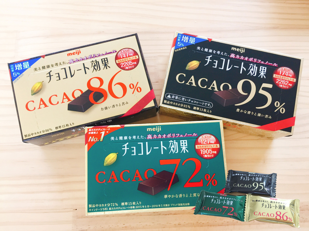 個人的にいろいろ食べ比べてみましたが、高カカオチョコレートの中では明治の「チョコレート効果72%」が一番バランスがとれているように思います。