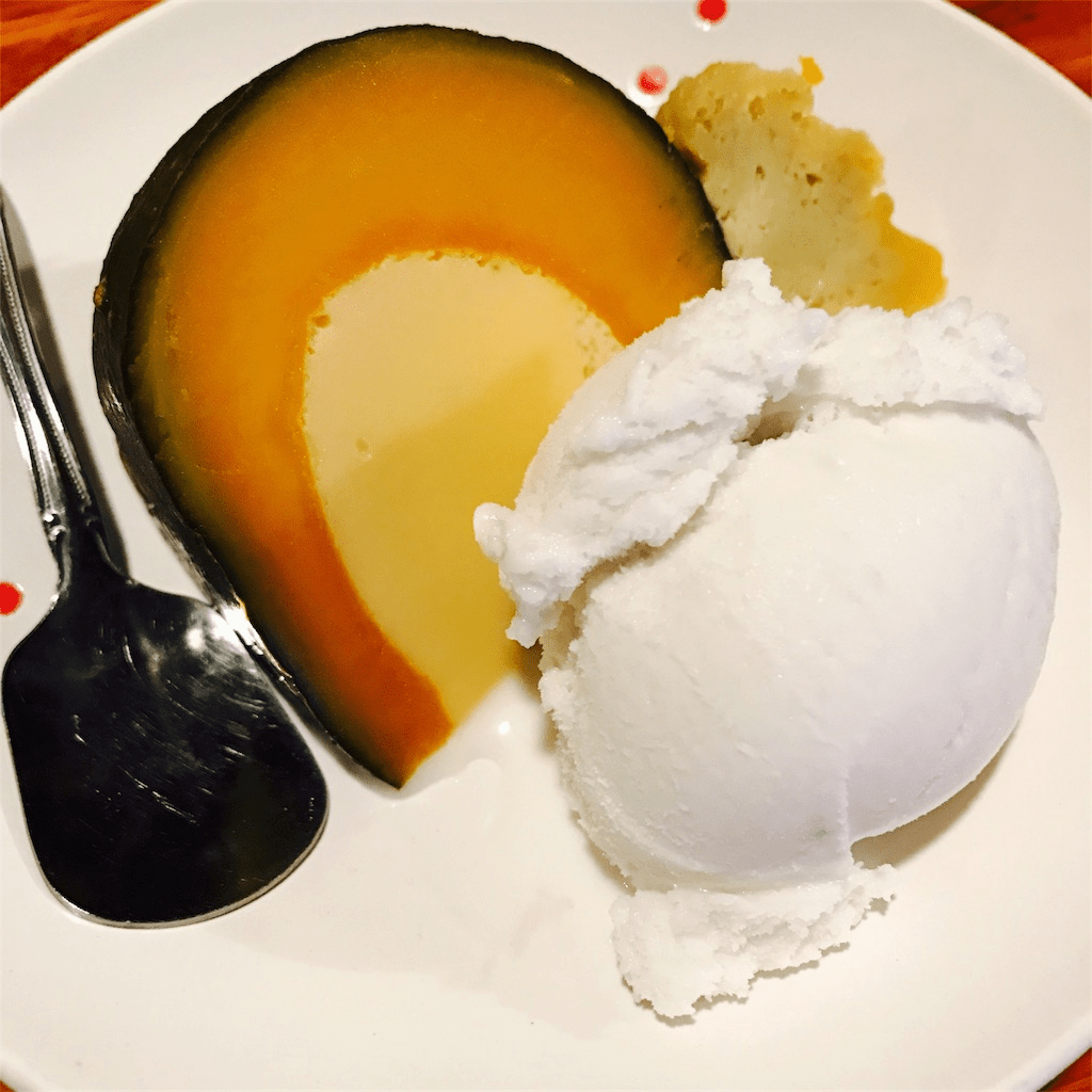 牛肉クイティウ(コメの麺)、カボチャケーキとココナッツアイスがお勧めです。