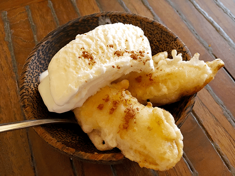 ここに来たら絶対にナシチャンプル(日替わりいろいろおかずごはん)とピサンゴレン・アイス(揚げバナナとバニラアイス)です!!