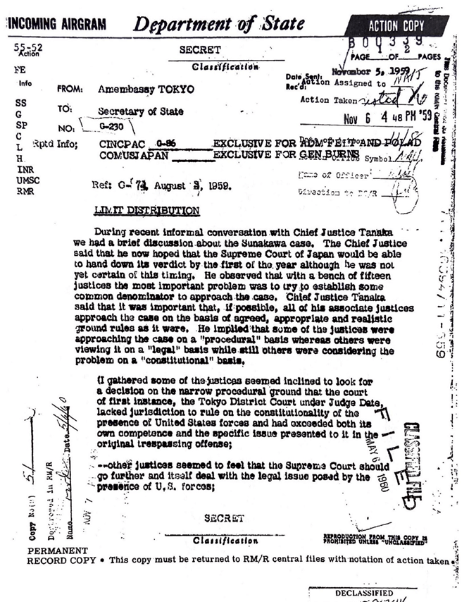 当時の最高裁判所長官、田中耕太郎が最高裁での判決内容の見通しなどをマッカーサー駐日大使に報告しながら裁判を進めていたということがアメリカの公文書の秘密解除によって2008年に明らかになりました。